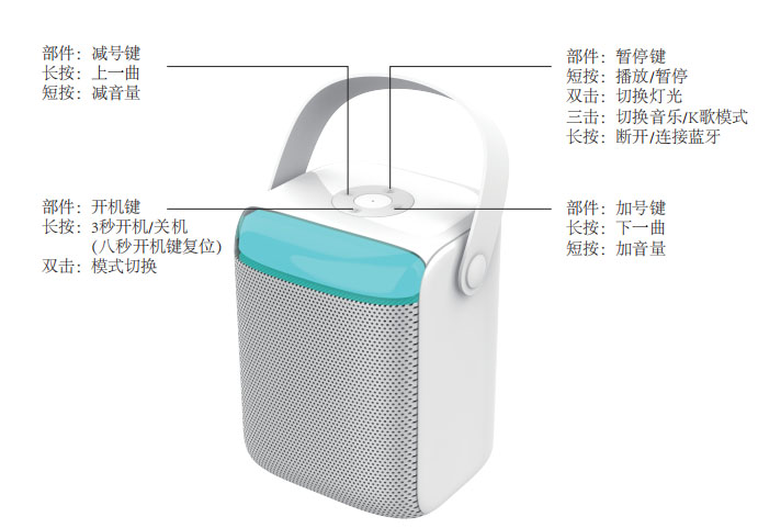 | 8 | Key function | Switch key: long press 3 seconds to start/long press 3 seconds to shut down, double click mode switch (BT-U disk), long press 8 seconds to reset the power key, plus key: short press to add volume Press and hold the first track, minus key: short press to reduce volume, long press the previous track, Pause key: Short press: play/pause, double click to switch the light, three clicks to switch: music mode/Karaoke mode (the default music mode on startup), long press to disconnect/connect Bluetooth, Note: the default music mode on startup, connect the microphone to automatically switch to karaoke mode. |