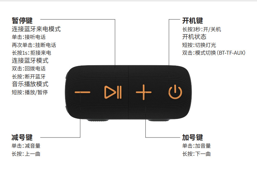 | 4 | TF card | Use TF card to insert the speaker and play music, while testing the key functions: up, next, play/pause, volume increase and decrease, pay attention to whether the sound has current sound, small sound, noise, broken sound, etc. | TF card functions normally |
